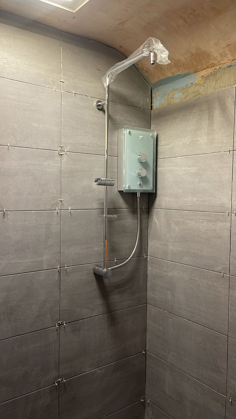 Wet room Floors and walls. Envelope cuts on the floor to enable water to flow into the drain and the pattern flowing up and around the walls.
